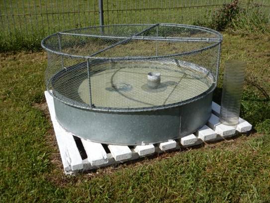 A standard Class A pan is used, 120.6 cm in diameter and 25 cm deep set on a